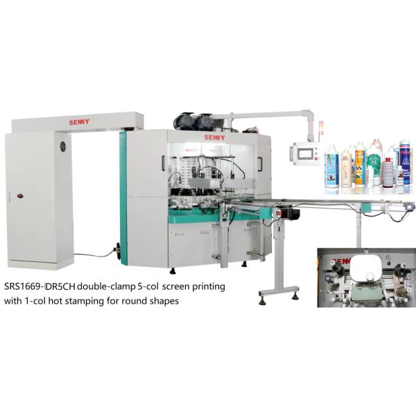 The machine is designed for all-round screen printing and hot stamping and can screen print or hot stamp round lotion bottles, cups, lids, cream jars in partial or 360 degrees.